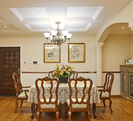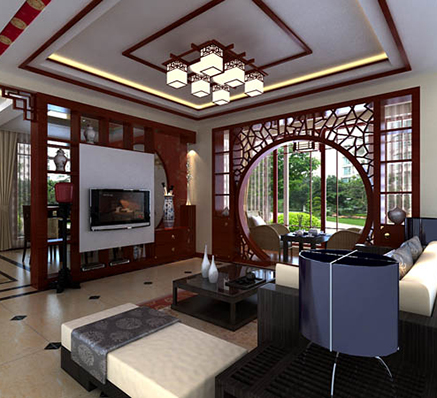 是以中國傳統(tǒng)文化作為背景,在色彩搭配上以黑、紅、為主,室內(nèi)多采用對(duì)稱式的布局方式,格調(diào)高雅,造型簡樸優(yōu)美,色彩濃重而成熟。
